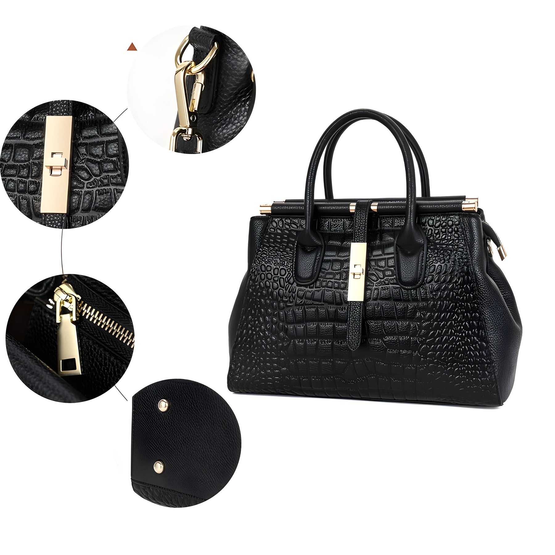 Elegance meets sophistication in the Crocodile™ Bag, exquisitely crafted with a luxurious alligator print on premium cowhide leather. Its structured design blends modern style with timeless charm. The gold-plated magnetic snap closure adds a bold contrast to the sleek black finish, elevating its chic appeal.