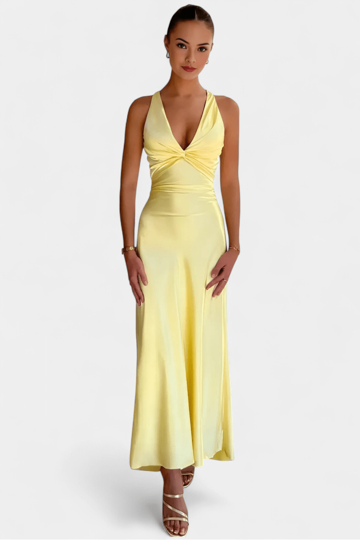 Elegant and refined, the Dolores Dress is designed to leave a lasting impression. With its plunging V-neckline, sculpting twist detail at the waist, and lustrous finish, it offers a flattering silhouette perfect for weddings, galas, and evening celebrations.