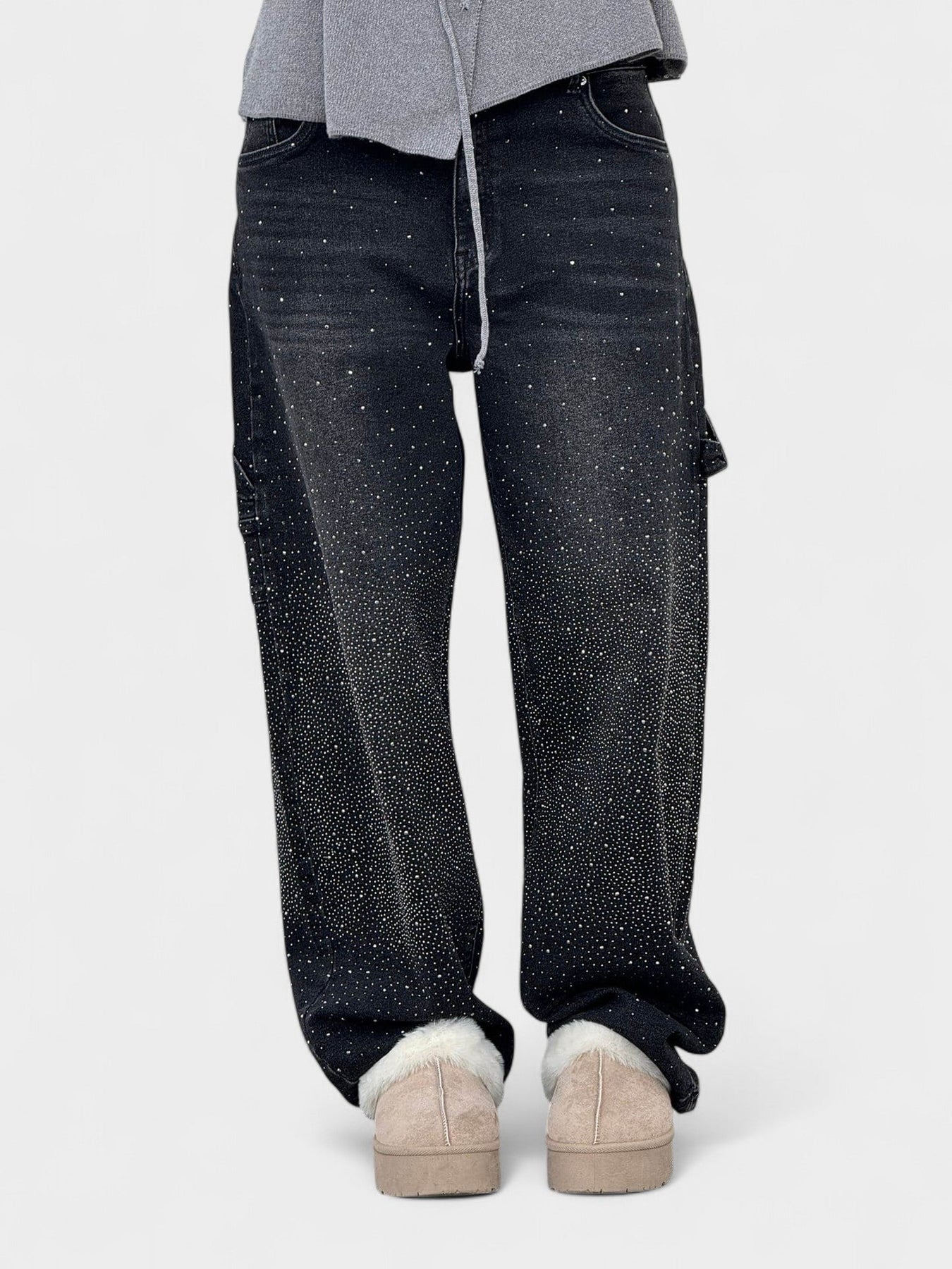 Denim meets brilliance. These carpenter-style balloon jeans are elevated with dazzling diamond-like jewel applications, turning a casual staple into a bold statement piece. Effortlessly blending street style with high-fashion sparkle.